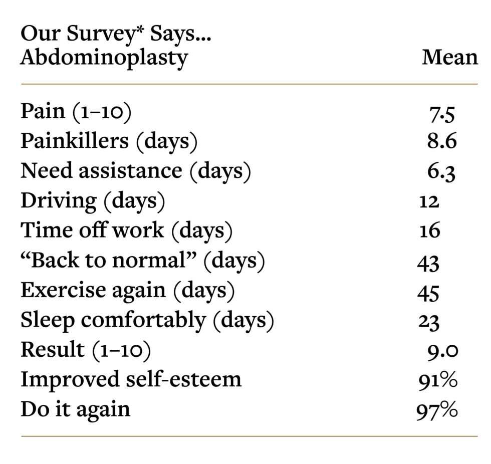 Patients in the recovery room after surgery are often already gratified by the change in their abdominal contour. Like breast augmentation, this immediate gratification helps to offset some of the discomfort. The local anesthetic is still working, and will continue to work for several hours.