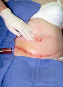 I use only one drain. The drain will accumulate bloody fluid after surgery. It is important to know that this fluid is mainly tissue fluid with a small amount of blood. It is quite diluted, so don’t worry that you are losing a lot of blood from the drain. You empty the drain when it is about a third or half full. If it gets too full, it will lose suction. It should always be collapsed, which indicates it is working to produce suction.