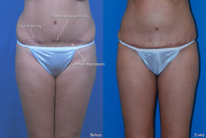 The central portion of the abdominoplasty may spread, depending on the patient’s healing characteristics and wound tension. Any factor that interferes with wound healing, such as an infection or skin loss (see above) can contribute to a wider, more conspicuous scar. After 6 months to a year, the tension has been relieved. At this point, the scar may be revised.