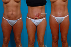 This 63-year-old nonsmoker had a tummy tuck and liposuction. She had an old scar across her right upper abdomen, from removal of her gall bladder 35 years ago. Prior to surgery, we discussed the fact that this scar would compromise circulation to the abdominal skin and possibly cause some skin loss, which is exactly what happened. The wound healed in gradually on its own. The patient was pleased despite the scar (which could have been revised but the patient did not find it a problem). The key to her satisfaction was knowing that this complication could occur and accepting that possibility.
