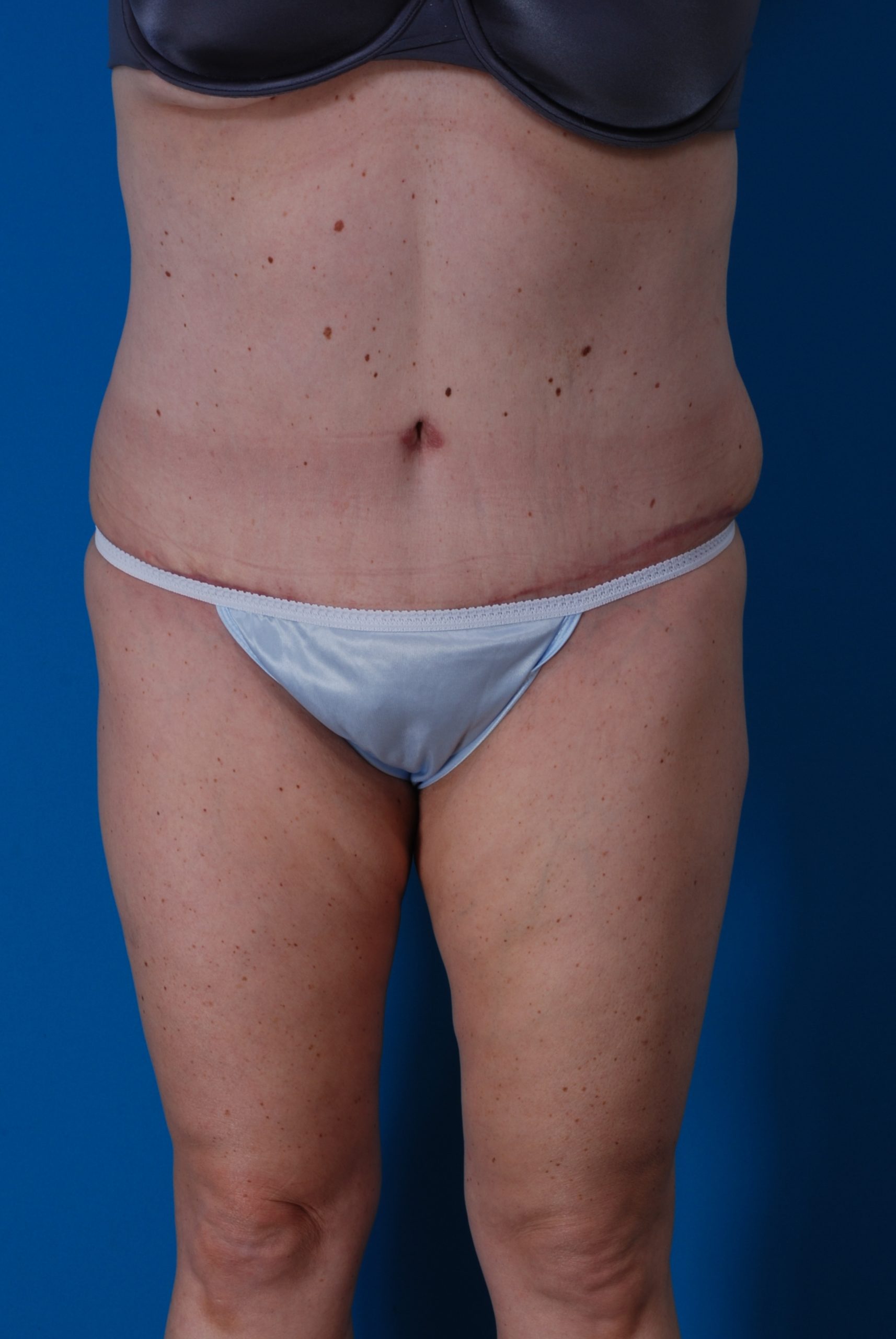 This patient had an unsightly scar from a previous tummy tuck performed elsewhere. The scar ran slightly above her bikini line and had widened. There was a contour depression associated with it. At surgery, I revised the scar, using anchoring sutures to keep it low and avoid upward migration. A deep tissue repair corrected the contour deformity. Liposuction was used to correct her muffin top deformity of the flanks and also taper the inner thighs. The umbilicus was lowered slightly, correcting its unnatural orientation.
