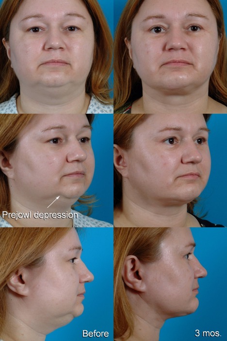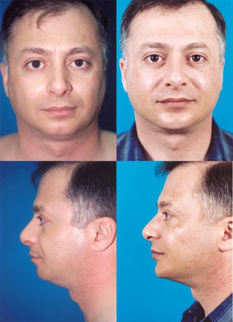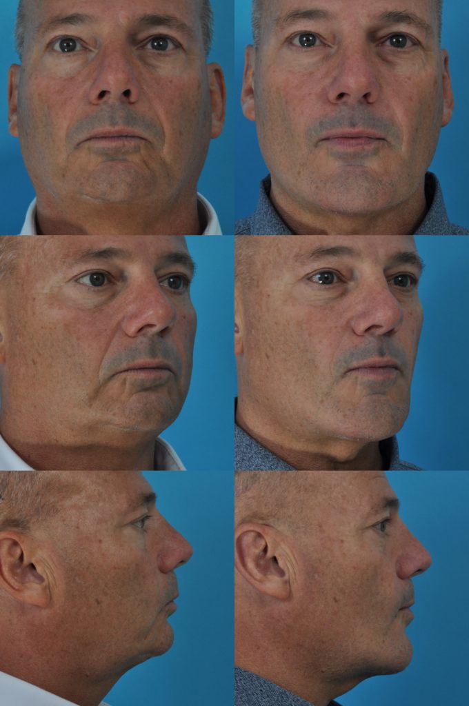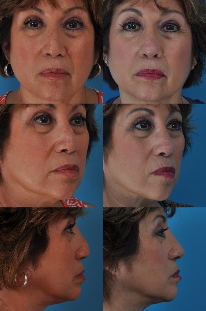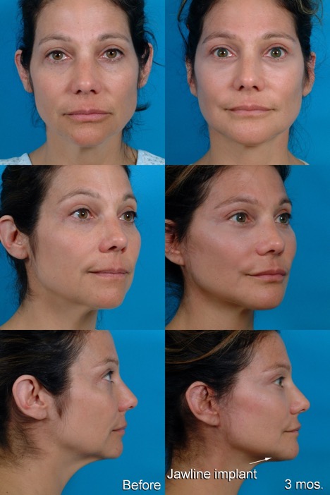 Procedure: Facelift, submental lipectomy, jawline implant, upper and lower blepharoplasties, endoscopic forehead lift, and periorbital CO2 laser resurfacing.