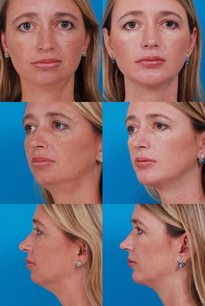 Procedure: Facelift, submental lipectomy, chin implant, resection of buccal fat pads, endoscopic forehead lift, tip rhinoplasty, pulsed dye laser treatment of facial veins, and fat injection of lips, jawline, and cheeks (12 cc).