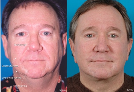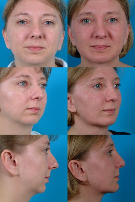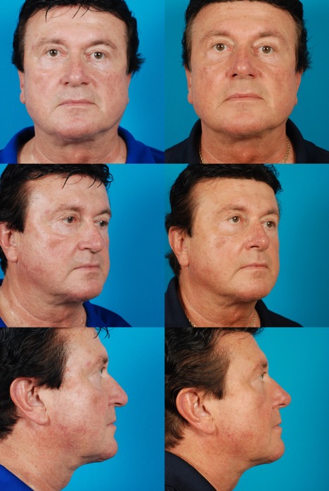 Procedure: Facelift, submental lipectomy, upper blepharoplasties, rhinoplasty, facial fat injection, and CO2 laser resurfacing. Secondary facelift 2 years later.