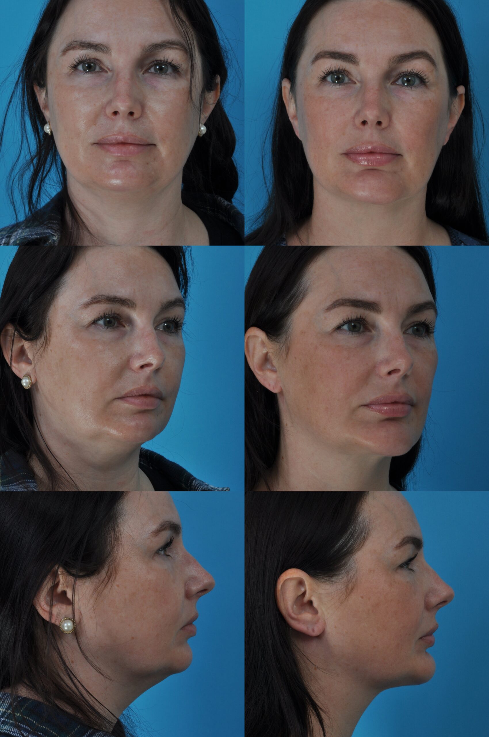 Procedure: Facelift, submental lipectomy, chin implant, upper and lower transconjunctival blepharoplasties, endoscopic forehead lift and CO2 laser resurfacing. Second procedure, 3 years later: fat injection (21 cc). Third procedure, 6 years later: erbium laser and fat injection of lips (4 cc).