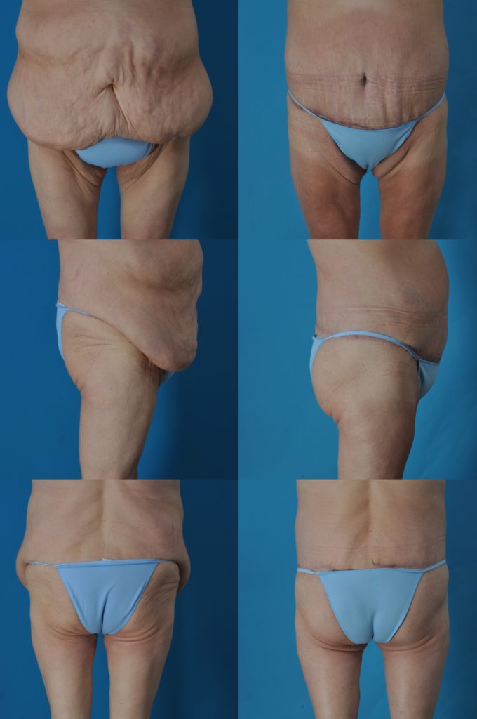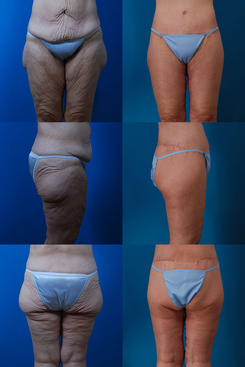 Surgery after massive weight loss is often a combination of procedures—breast lift (often with implants), abdominoplasty, thigh and buttock lift, brachioplasty, and liposuction.