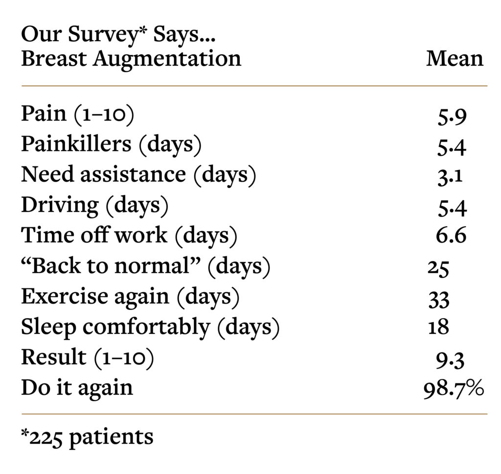 To better understand how well breast augmentation was meeting our patients’ expectations, we conducted a survey among 225 consecutive patients. Breast self-consciousness dropped from 86.2% to 12.6%. Remarkably, over 90% of women report an improvement in self-esteem after breast augmentation. No other cosmetic surgical procedure can match breast augmentation for patient satisfaction (98.1%). In our survey, the average result rating was 9.3 out of 10 on a scale of 1–10 and the median rating was 10, meaning that over half of patients scored their result a perfect 10 (!) and 98.7% of patients would do it again. (Swanson E. Prospective outcome study of 225 cases of breast augmentation. Plast Reconstr Surg. 2013;131:1158–1166.)