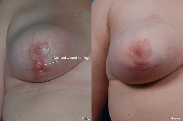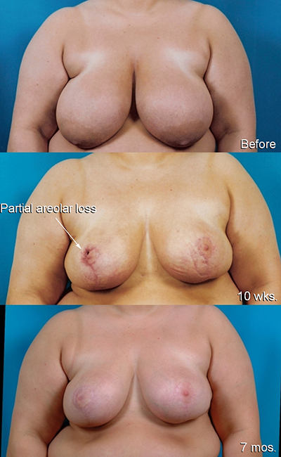Comments: This 29-year-old obese nonsmoker developed loss (necrosis) of a portion of her right areola after a breast reduction. This wound was treated with dressing changes and went on to heal with an acceptable scar. No revision was necessary.