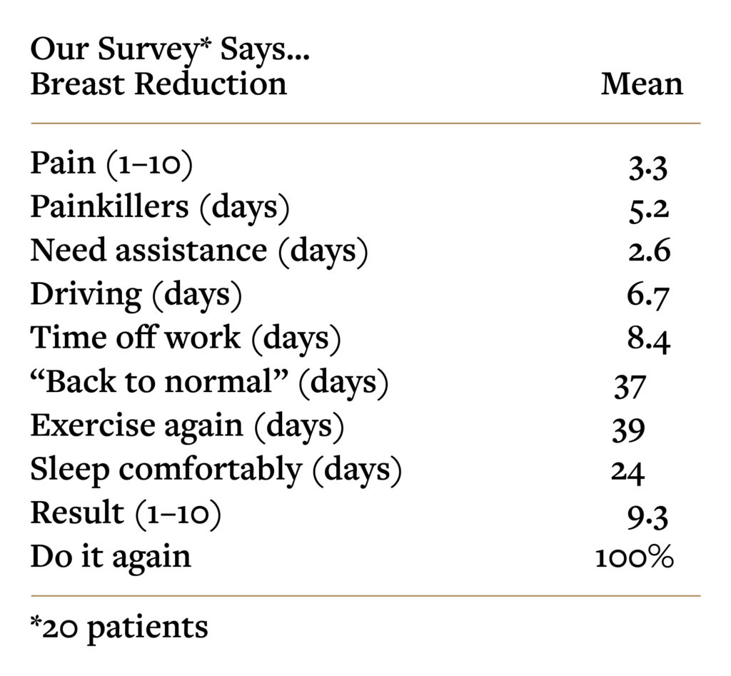 A: The average pain level is quite modest—only 3.3 on a scale of 1–10. The recovery after a breast reduction is usually easier than patients expect.
