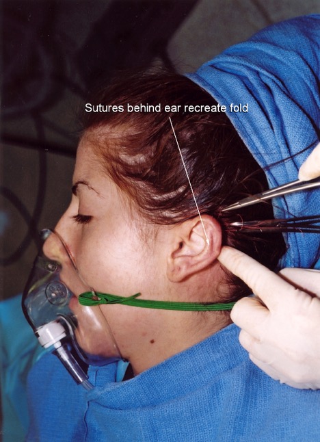 The surgery is done with the patient asleep under intravenous sedation. An incision is made in the crease (“postauricular”) behind the ear. The cartilage is exposed. A fold is created using sutures that fold the cartilage on itself. As these sutures are tied down, the surgeon judges the degree of correction. The placement of the sutures is adjusted to achieve just the right amount of folding and just the right degree of ear projection while avoiding any undue crimping of the border of the ear.