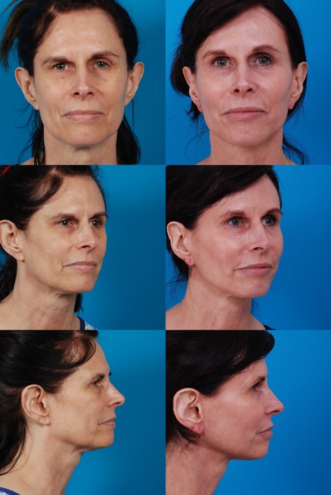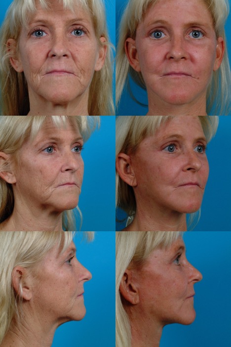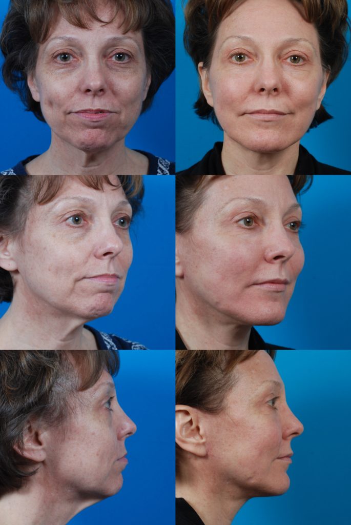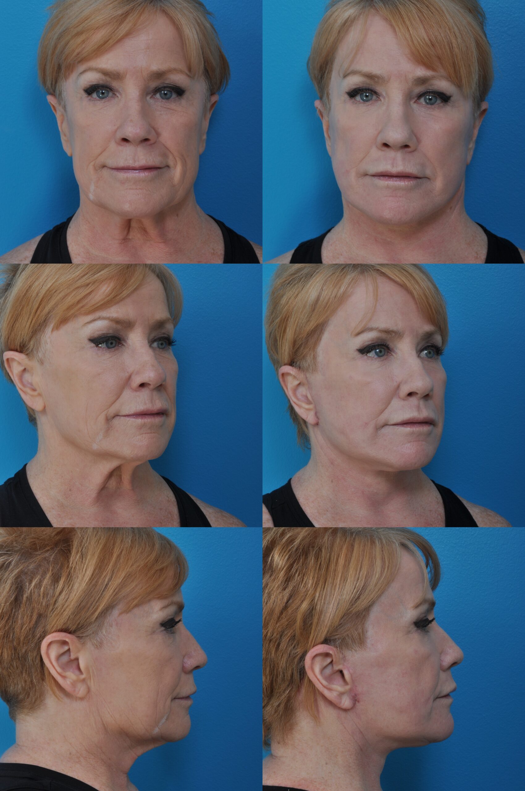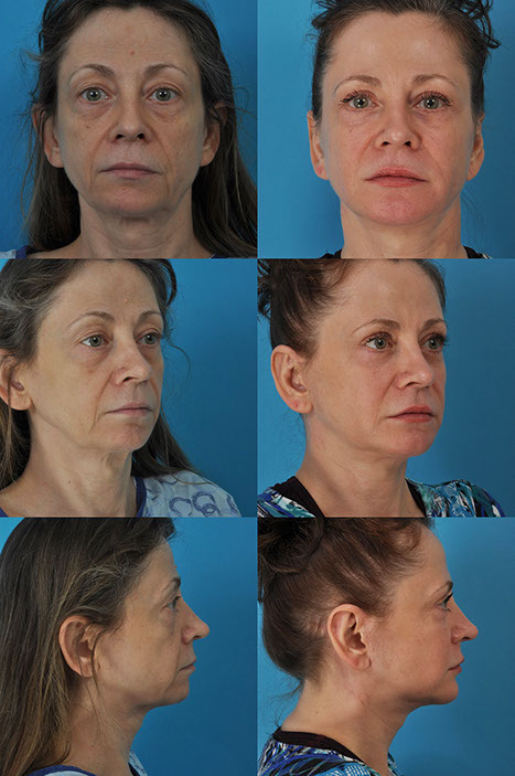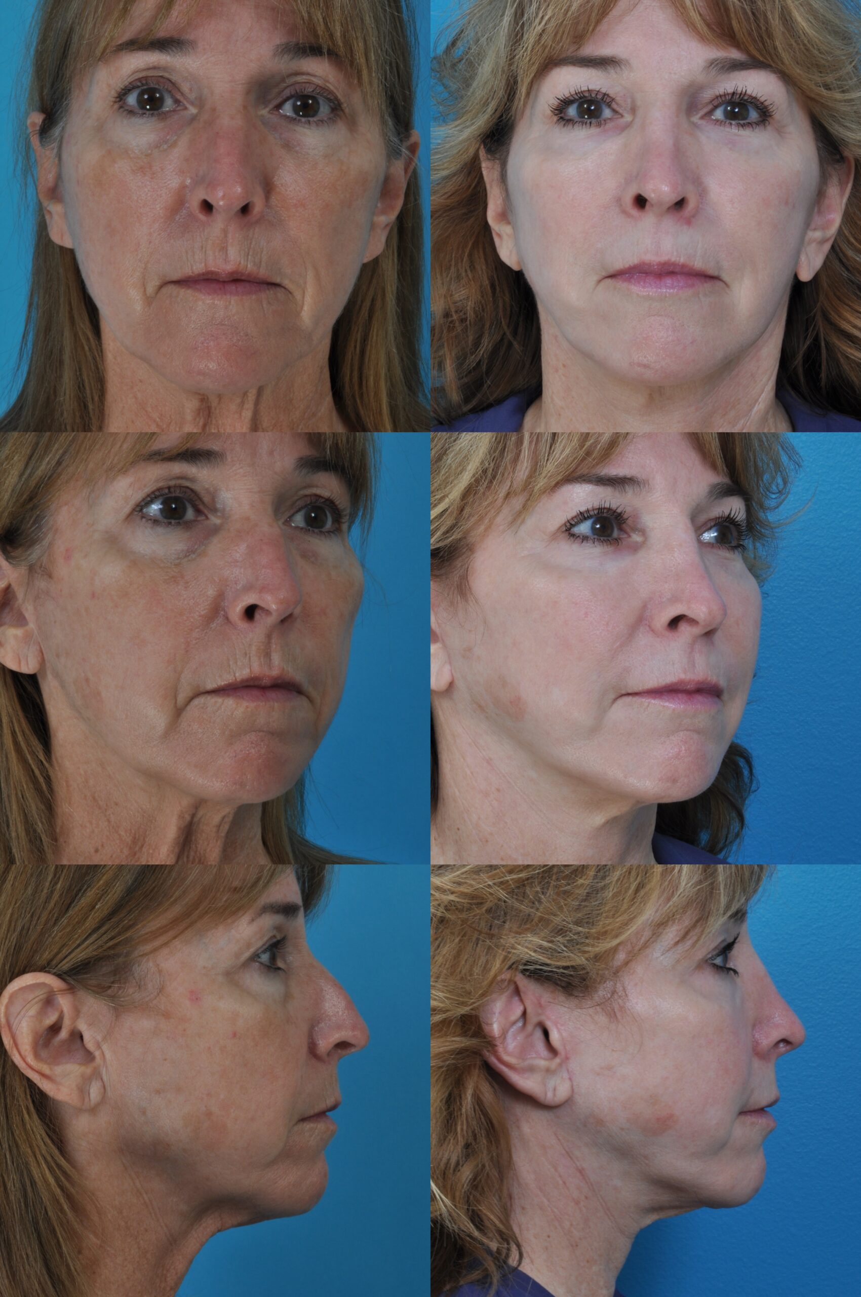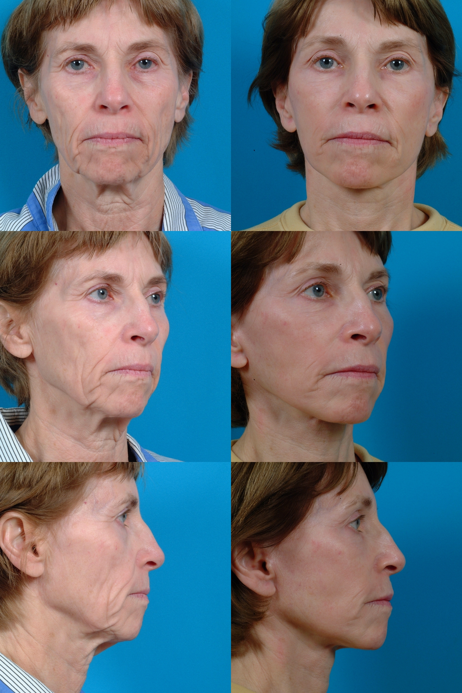 Procedure: Facelift, submental lipectomy, chin implant, upper and lower transconjunctival blepharoplasties, endoscopic forehead lift and CO2 laser resurfacing. Second procedure, 3 years later: fat injection (21 cc). Third procedure, 6 years later: erbium laser and fat injection of lips (4 cc).
