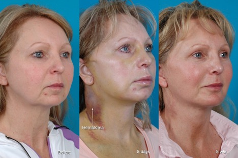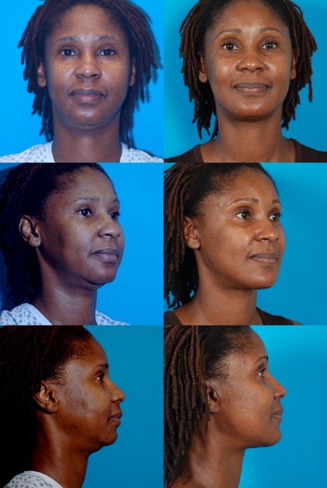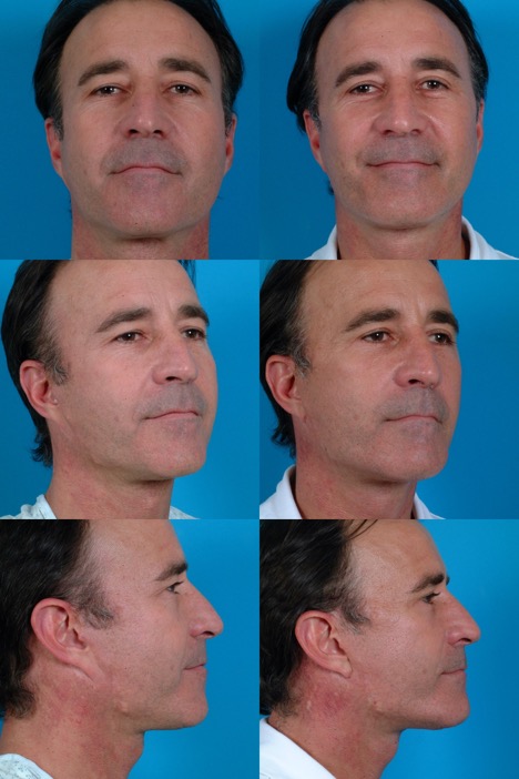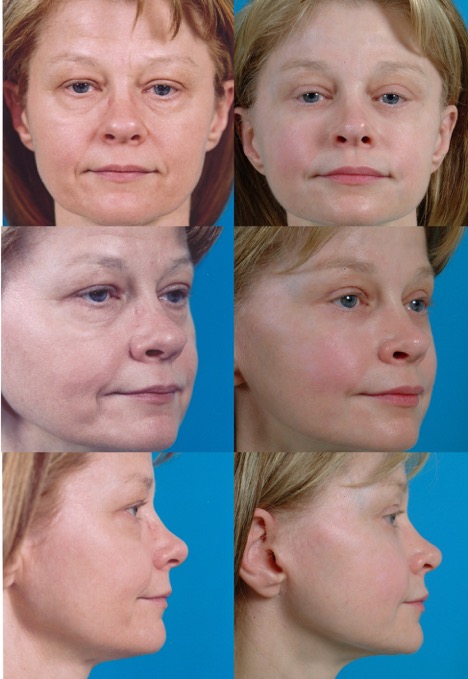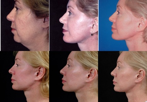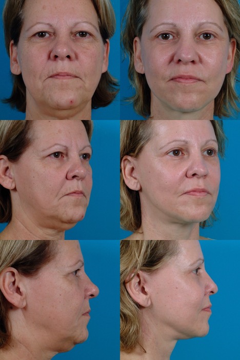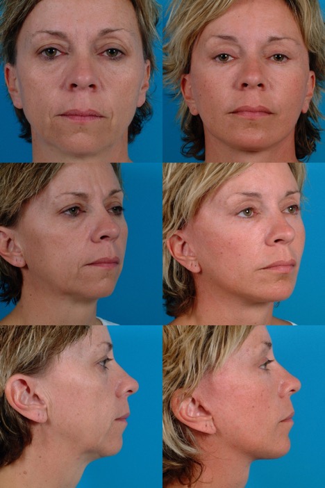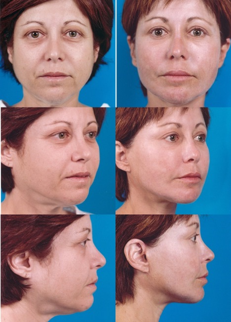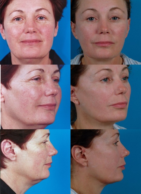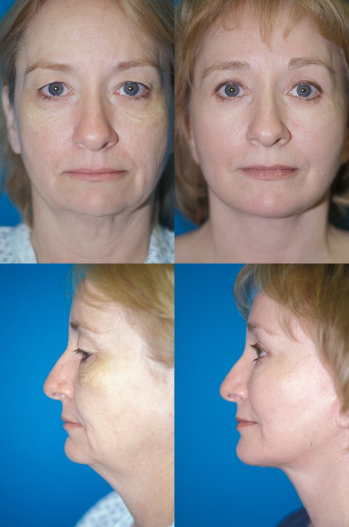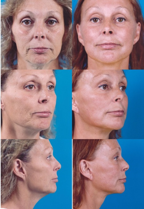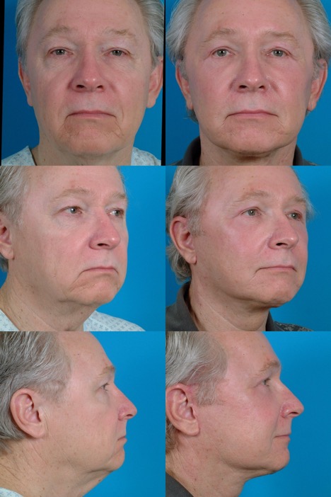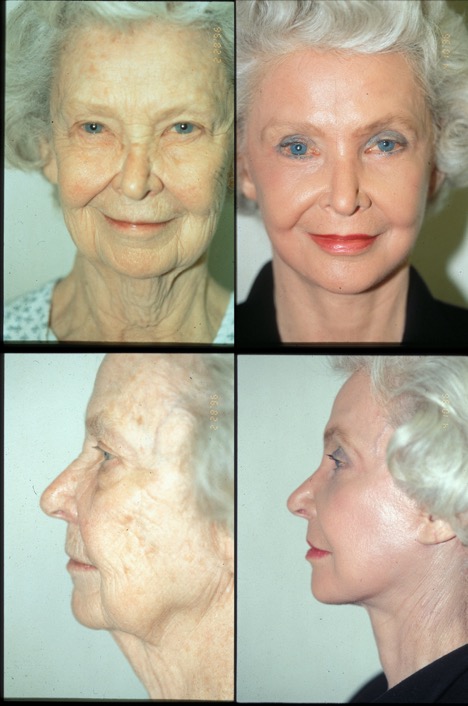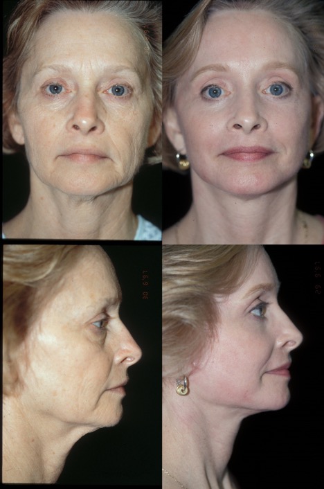 Procedure: Facelift, submental lipectomy, upper blepharoplasties, rhinoplasty, facial fat injection, and CO2 laser resurfacing. Secondary facelift 2 years later.