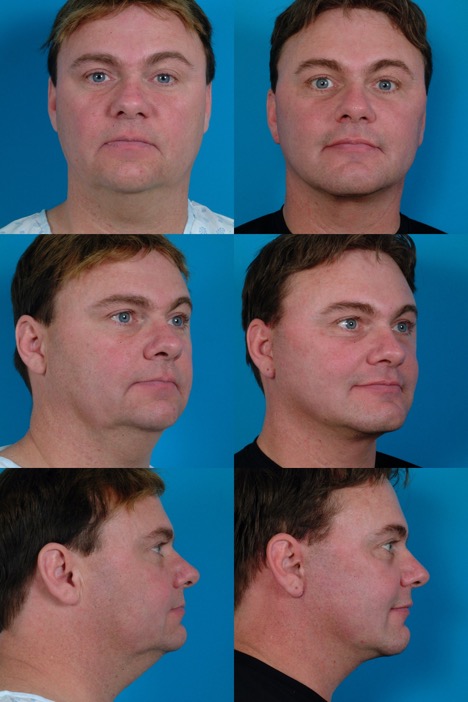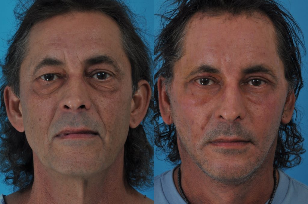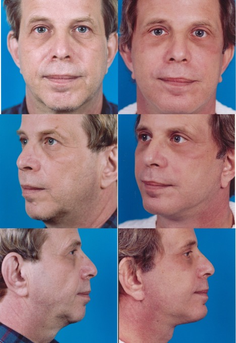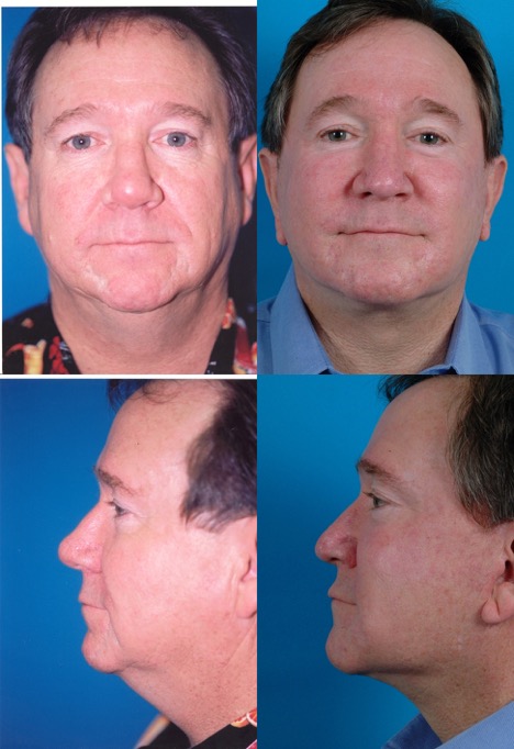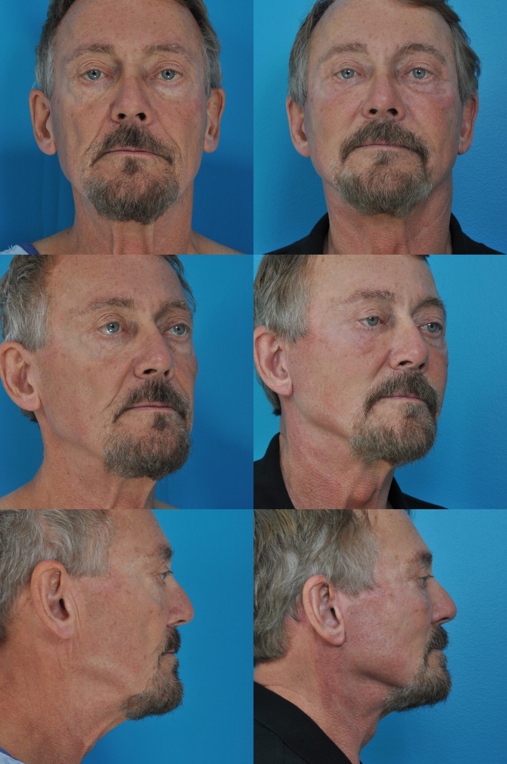 Procedure: Facelift, submental lipectomy, jawline implant, upper and lower blepharoplasties, endoscopic forehead lift, and periorbital CO2 laser resurfacing.