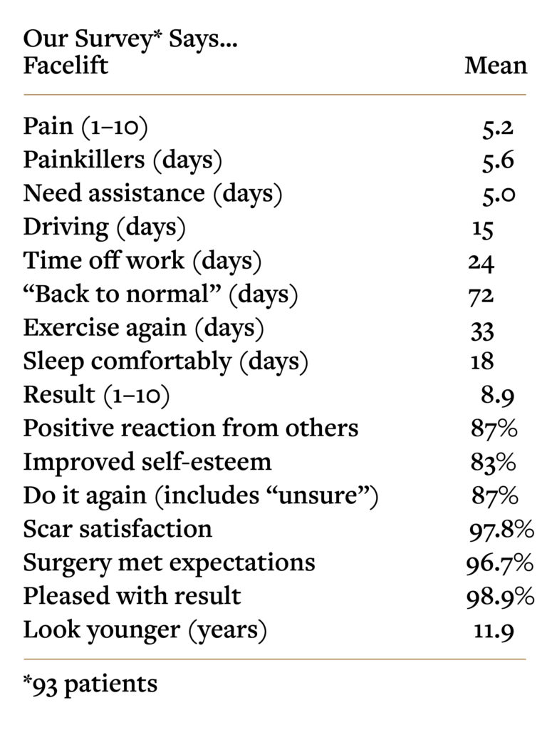 Remarkably, surveys completed by the patients themselves (not the age raters) showed that 97% thought they looked younger after surgery and the average subjective age reduction was 12 years (range, 0–27.5 years), double the objective findings by the age raters (Swanson E. Outcome analysis in 93 facial rejuvenation patients treated with a deep-plane face lift. Plast Reconstr Surg. 2011;127:823–834).