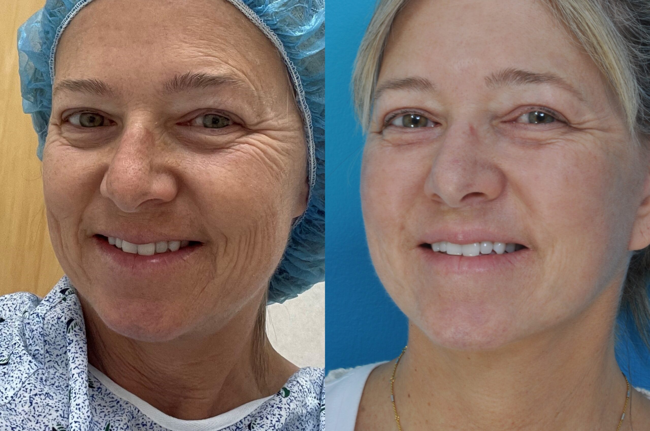 Procedure: Facelift, submental lipectomy, upper and lower blepharoplasties, facial fat injection (36 cc), endoscopic forehead lift, and CO2 laser resurfacing.