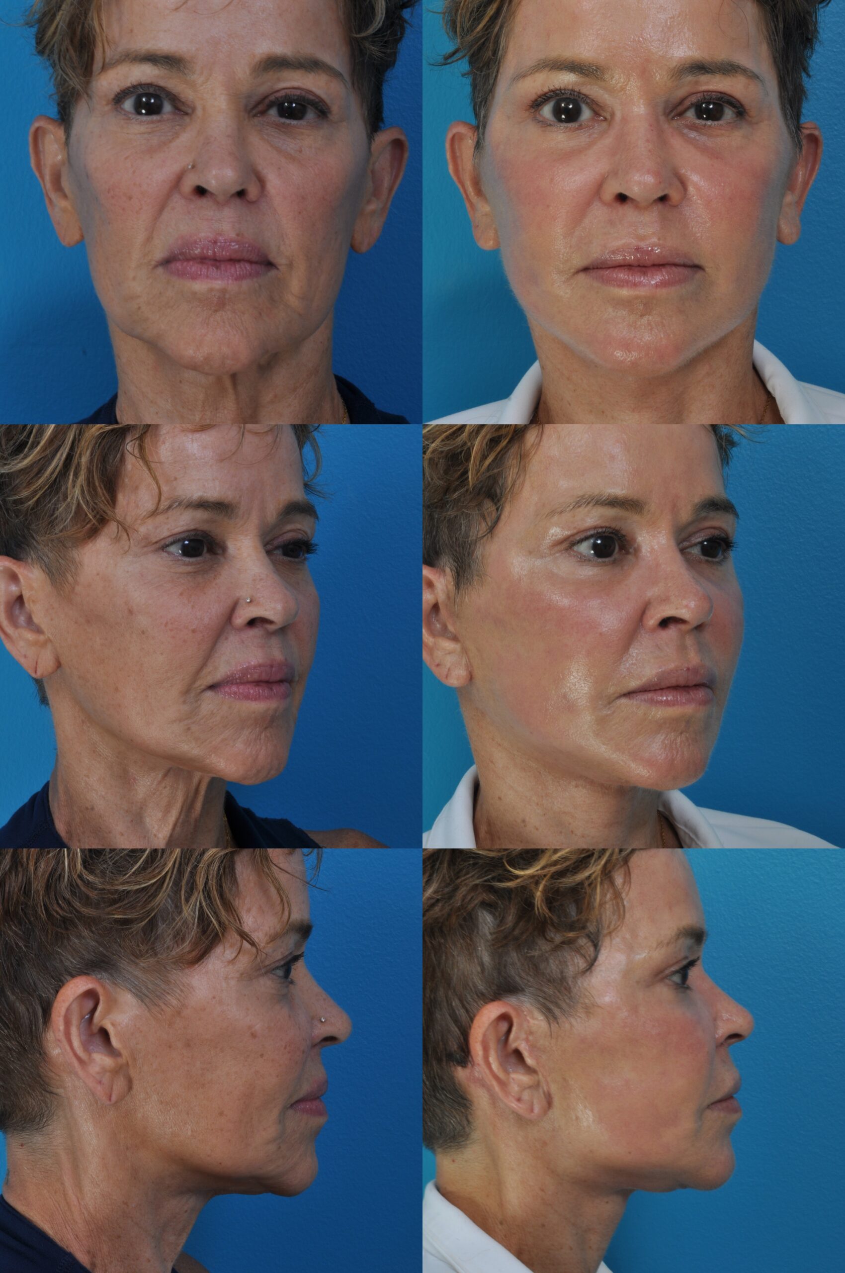 Procedure: Facelift, submental lipectomy, chin implant, resection of buccal fat pads, endoscopic forehead lift, tip rhinoplasty, pulsed dye laser treatment of facial veins, and fat injection of lips, jawline, and cheeks (12 cc).