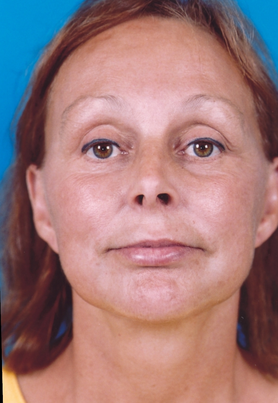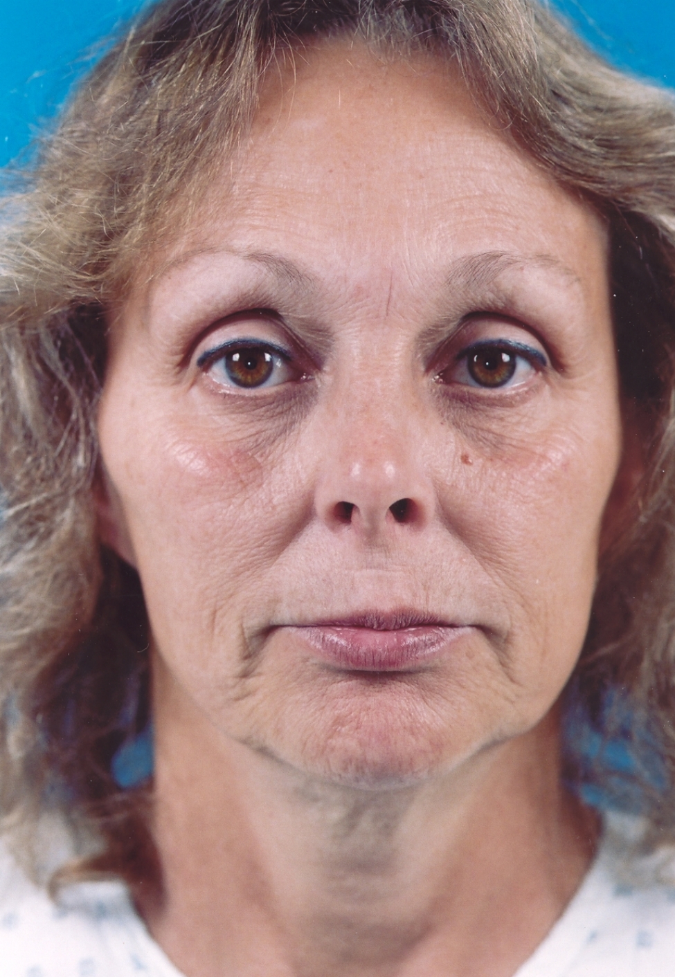 Procedure: Facelift, submental lipectomy, chin implant, upper and lower transconjunctival blepharoplasties, endoscopic forehead lift and CO2 laser resurfacing. Second procedure, 3 years later: fat injection (21 cc). Third procedure, 6 years later: erbium laser and fat injection of lips (4 cc).