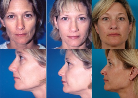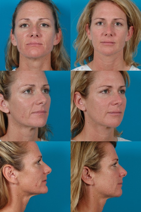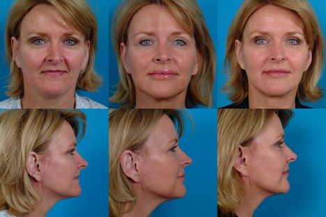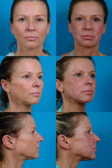 First Procedure: Lower blepharoplasties, fat injection of lips and nasolabial creases, periorbital and perioral erbium laser resurfacing. Second procedure; 4 years later: Upper blepharoplasties. Third procedure; 7 years later: Submental lipectomy