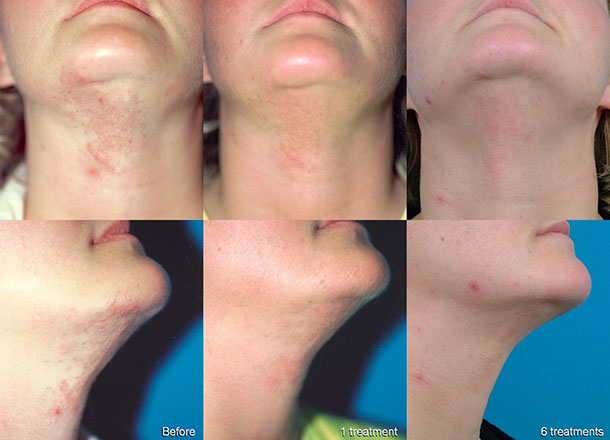 A: There is some discomfort. The analogy is a rubber band snapping on the skin. After awhile it does not seem to hurt as much. However, there are areas of the face and body, such as the upper lip and flanks that seem to be more sensitive. The cooling unit is very helpful in making it less uncomfortable. The treatment should be a little uncomfortable, but it should not be too painful either. The energy setting is adjusted to strike the right balance. Another clue is the redness of the skin. A little redness is desirable but a lot of redness may indicate the power setting is a little too high. Almost everyone can tolerate it. We’ve even treated 12-year-old girls on occasion.