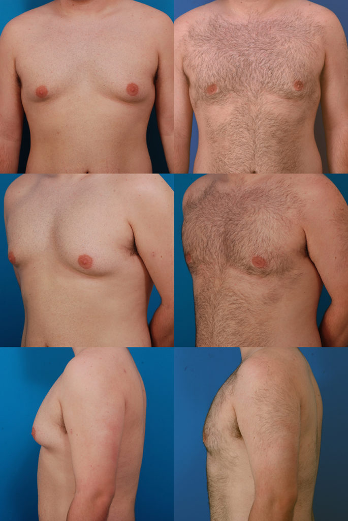 Most commonly, there is no underlying hormonal imbalance and no medical cause. Gynecomastia is seen predominantly in two age groups: (1) young men, whose pubertal breast bud development did not go away, and (2) men aged 50 and over, when breast development can occur due to hormonal changes. Excess breast tissue is unresponsive to diet and exercise. Although cosmetic, the problem is not trivial. Men have told me, “This makes me feel like I’m a woman,” even one memorable heavily-tattooed patient of mine who competes as an ultimate fighter. Another patient, a successful trial attorney in his early 60s, told me after surgery, “For the first time in my life, I feel normal.” He said he thought his breast problem had made him try to overcompensate by being aggressive professionally. One young man told me he faked hydrophobia as a teenager, even to the point of seeing a psychiatrist, so he would not have to take off his shirt for swimming classes in high school. Another told me no one had seen him without his shirt off since he was 15, including his fiancée. The psychological implications of this eminently correctable problem can be profound.