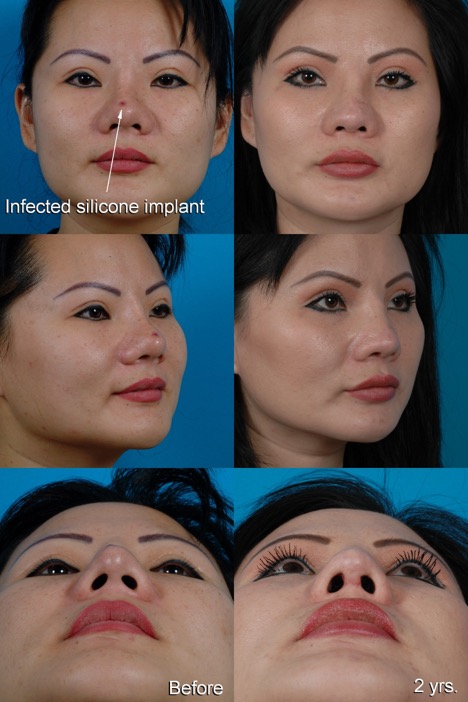 Asian plastic surgeons often use silicone implants in their Asian patients to augment a flat dorsum. These L-shaped implants do not absorb over time, and the operation is fast and relatively easy, because the graft material is off-the-shelf and there is no need for additional dissection to harvest graft material. The downside is that silicone implants are encapsulated by the body and remain foreign objects, subject to movement, infection, and possibly extrusion (sticking through the skin) in rare instances.