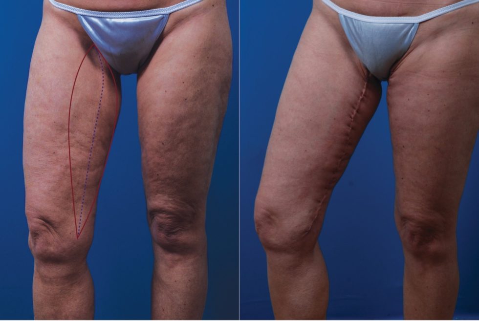 A different approach, similar to the arm lift, is more effective – a longitudinal excision of excess skin from the inner thighs. This method leaves a scar down the inseam of the thigh. It is very effective in removing extra unwanted skin which is distributed around the circumference of the thigh. For patients with very loose skin, particularly after massive weight loss, the trade-off is favorable.
